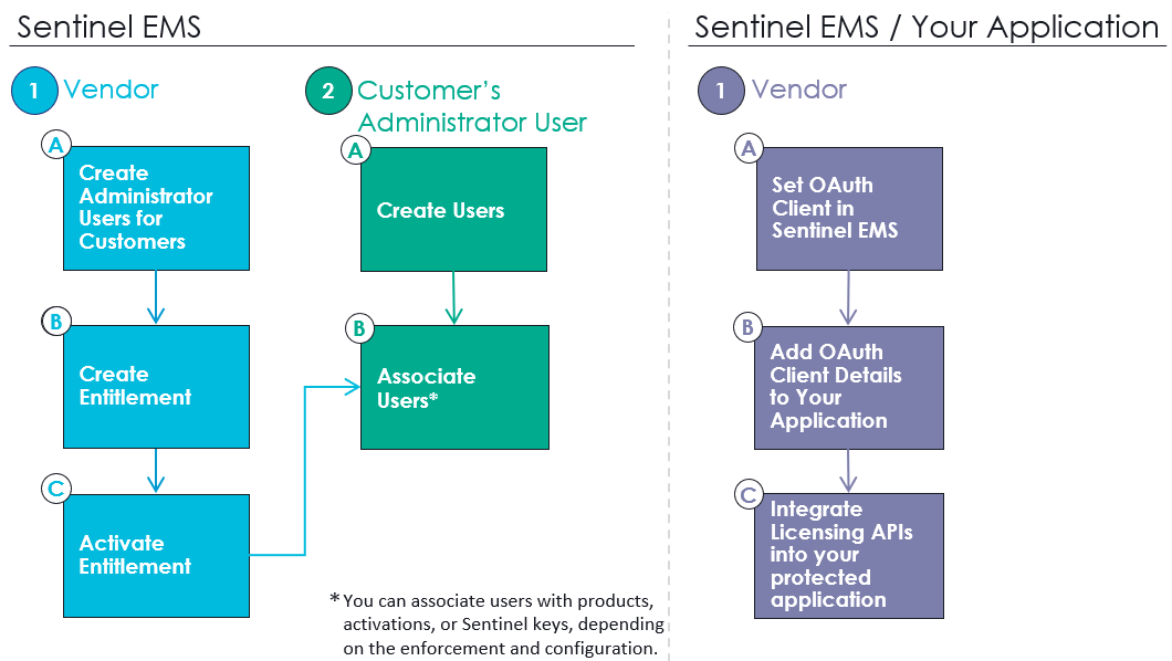 The following diagram illustrates the unique steps that comprise the cloud licensing flow for user-based licensing. This diagram assumes that you have already set up your catalog with products and features for your protected applications. You can perform the OAuth client-related tasks at any time, as they are not dependent on other steps in Sentinel EMS.