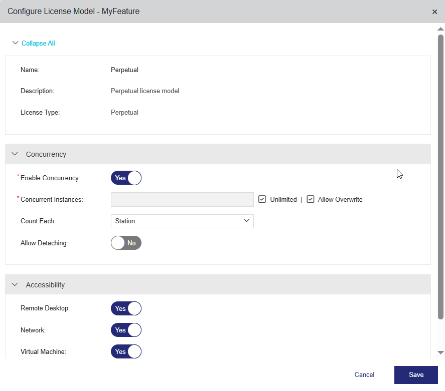 –(Optional) Click the Configure License Model button to modify the license model attributes as needed. Then click Save to close the window.