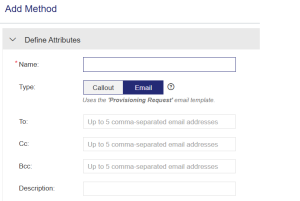 Type of provisioning request: >Callout: Calls an API or a web service to process the provisioning request based on the callout attributes. Use callout provisioning for fully automated, API-based integrations suited to high-volume or enterprise workflows. >Email: Automatically triggers an email upon activation of provisioning-enabled products, based on the configured email attributes and provisioning request email template. Use email provisioning when automation is limited, manual validation is required, or the provisioning system does not support API integration—best for low-volume or controlled setups. |